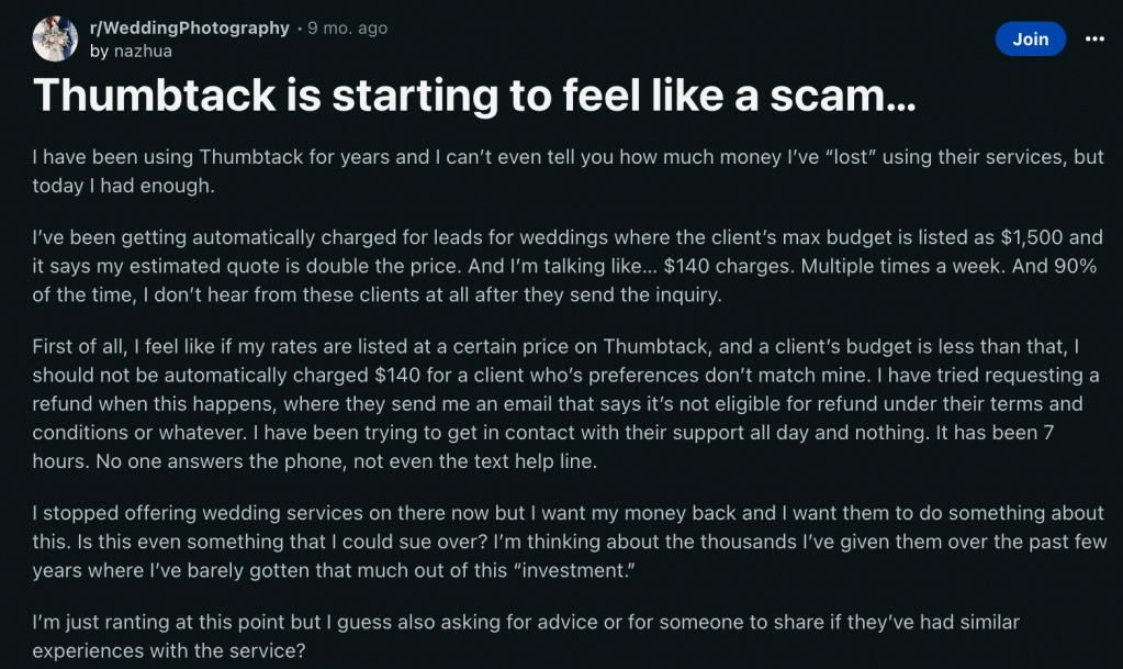 Thumbtack’s fees can escalate quickly, further eroding the earnings of service providers. We found another photographer on Reddit who sparked an interesting conversation about Thumbtack’s “scam” like behavior: