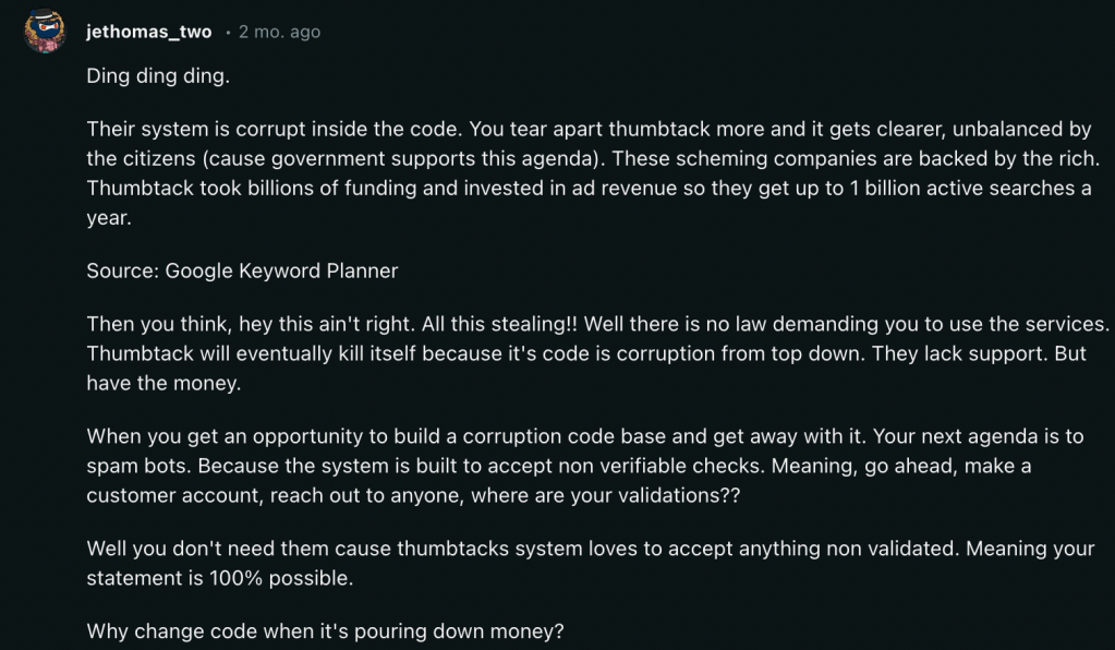 Thumbtack’s platform encourages fierce competition among service providers, often leading to a race to the bottom in terms of pricing. When multiple providers bid on the same job, clients tend to choose the lowest bidder, which can result in creators undercutting their prices to win contracts. This relentless price pressure can make it challenging for creators to maintain fair pricing and sustain their businesses the the while stirring animosity in the communities of the service providers.